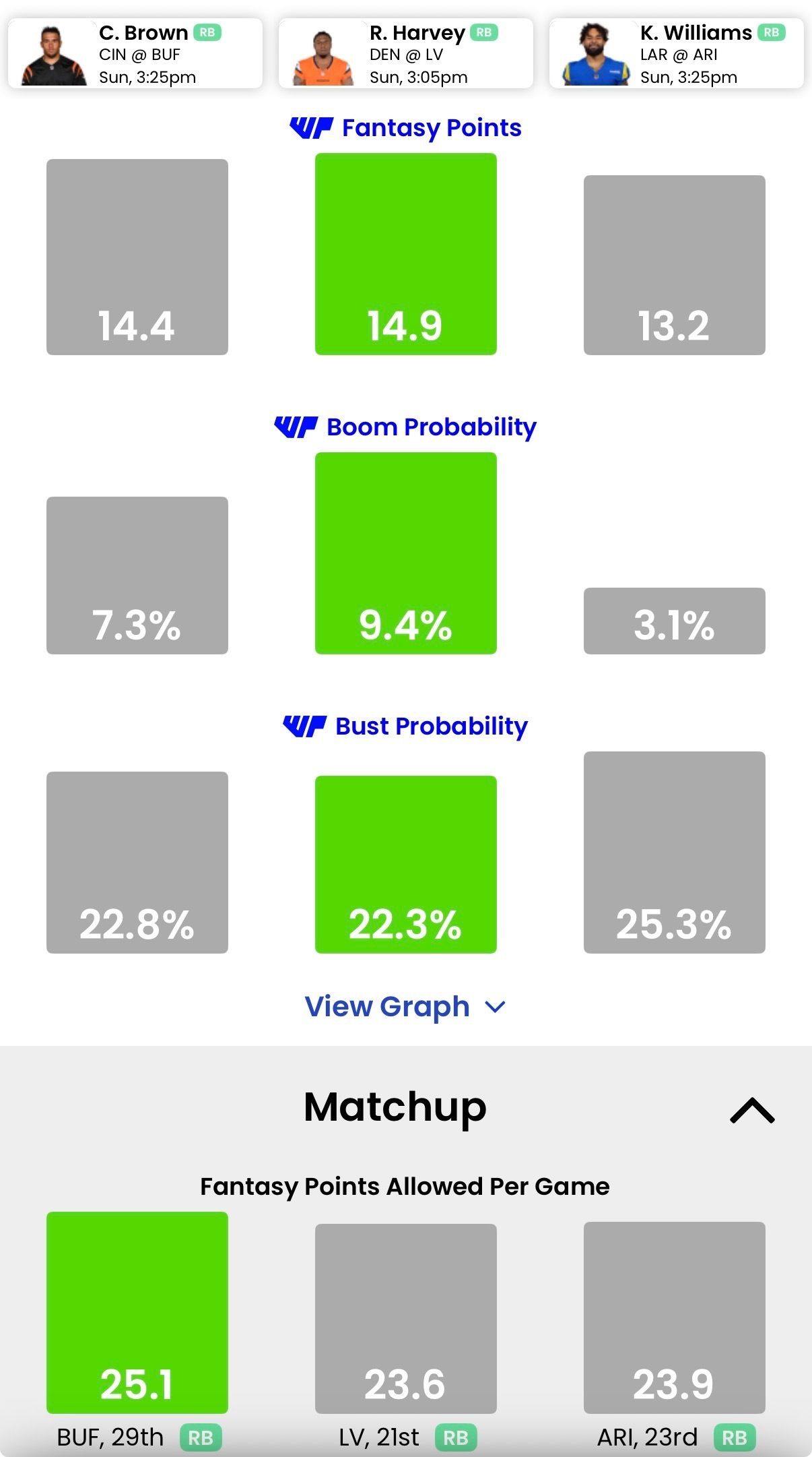 If you can’t decide between two to three players, Walter will compare those players for you. You are then able to see Walter’s projected points, the players’ boom/bust probability, and the defense’s rank for each of those players.