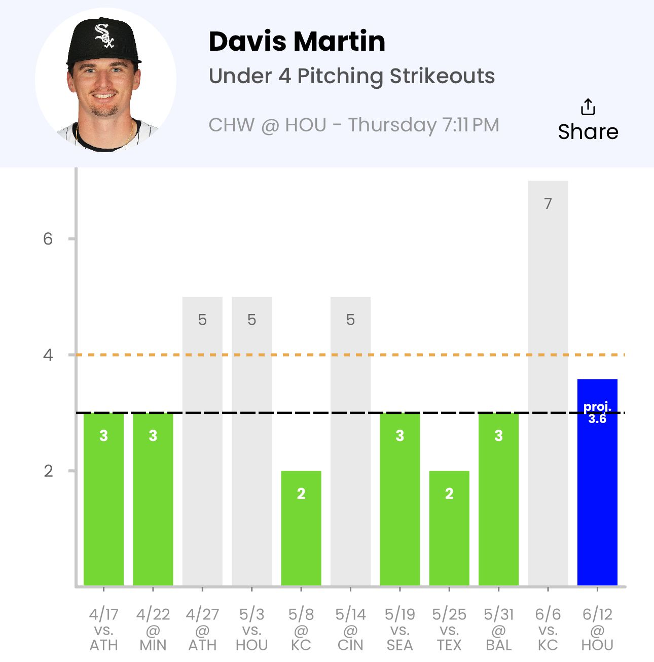 Davis Martin UNDER 4 Pitching Strikeouts (-137 on PrizePicks)