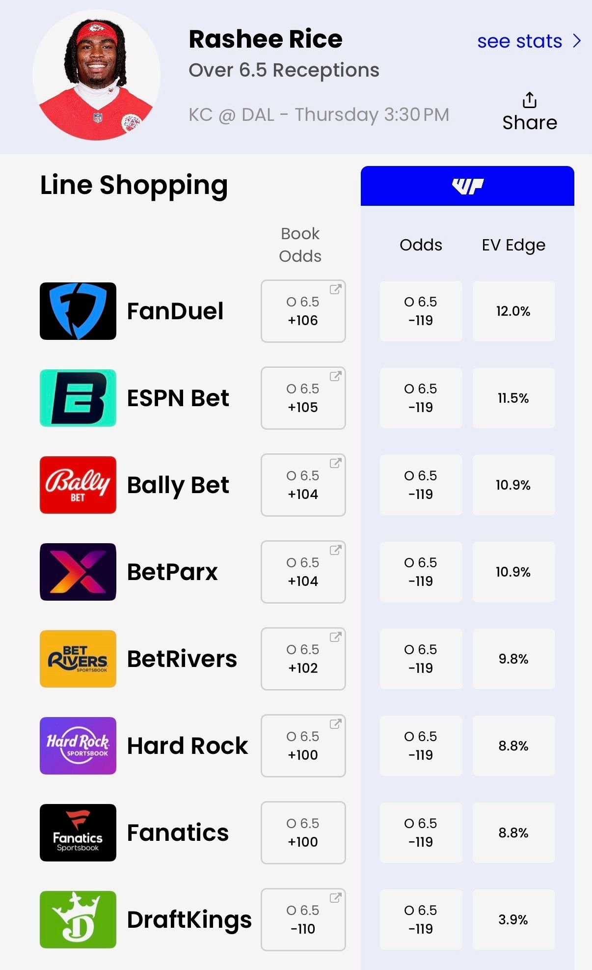 With a 12% EV Edge at FanDuel, Walter believes this is a bet worth taking on Thursday afternoon. Rice is projected for 7.9 receptions in our Player Prop Evaluator.