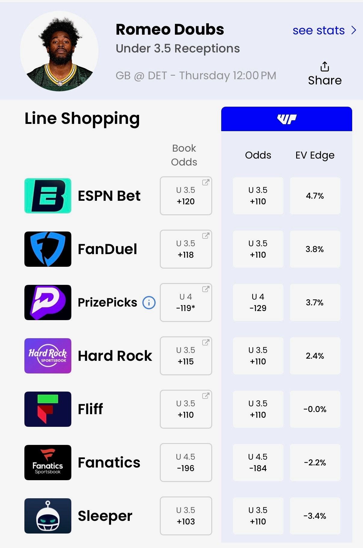 With a 4.7% EV Edge at ESPN Bet, Walter believes this is a bet worth taking on Thanksgiving. Doubs is projected for 2.8 receptions in our Player Prop Evaluator.