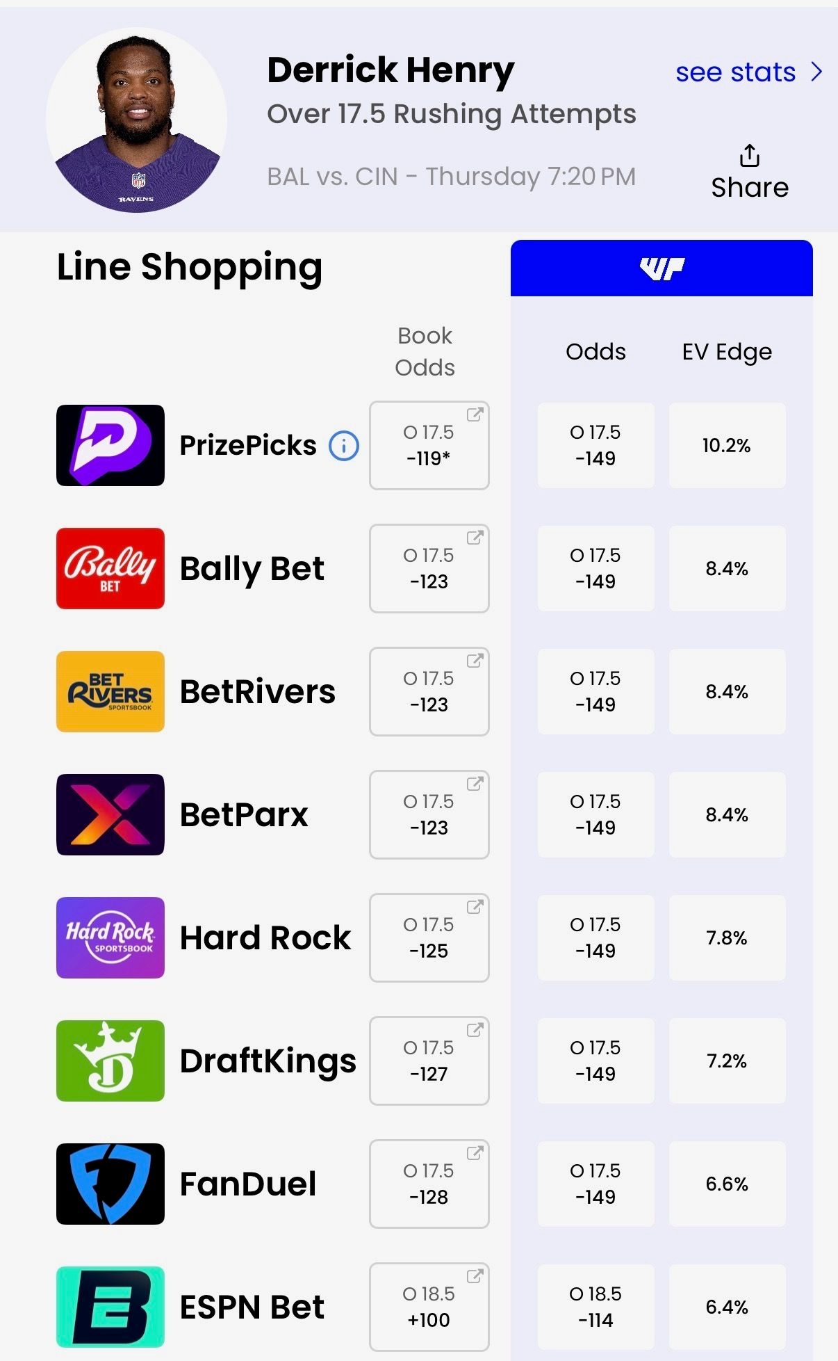 With a 10.2% EV Edge at PrizePicks, Walter believes this is a bet worth taking on Thursday night. Henry is projected for 22.4 rush attempts in our Player Prop Evaluator.