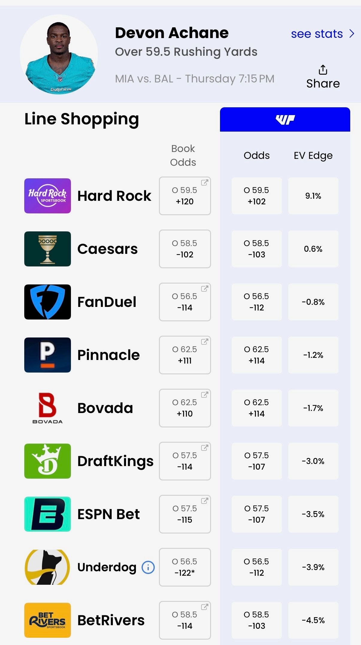 With a 9.1% EV Edge at Hard Rock, Walter believes this is a bet worth taking on Thursday night. Achane is projected for 63.9 rush yards in our Player Prop Evaluator.
