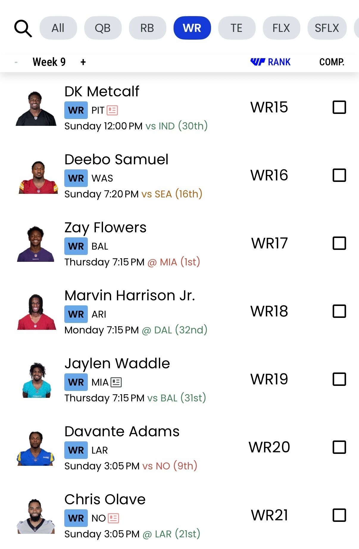 That's good enough to start him in most formats this week against the Ravens. Baltimore has given up the second-most fantasy points and third-most receptions per game to opposing WRs this season. Rome Odunze just caught seven passes for 114 yards last week against this secondary.