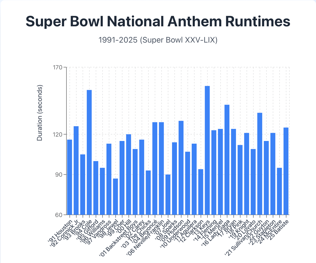 The longest anthem since 1991 belongs to Alicia Keys - her anthem was 2 minutes, 35 seconds.